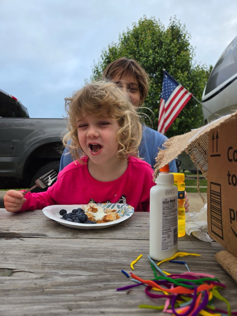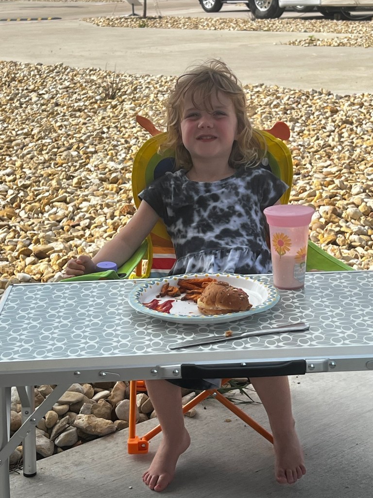 Dinner on eclipse day was Mahi burgers. This made Odette very happy.