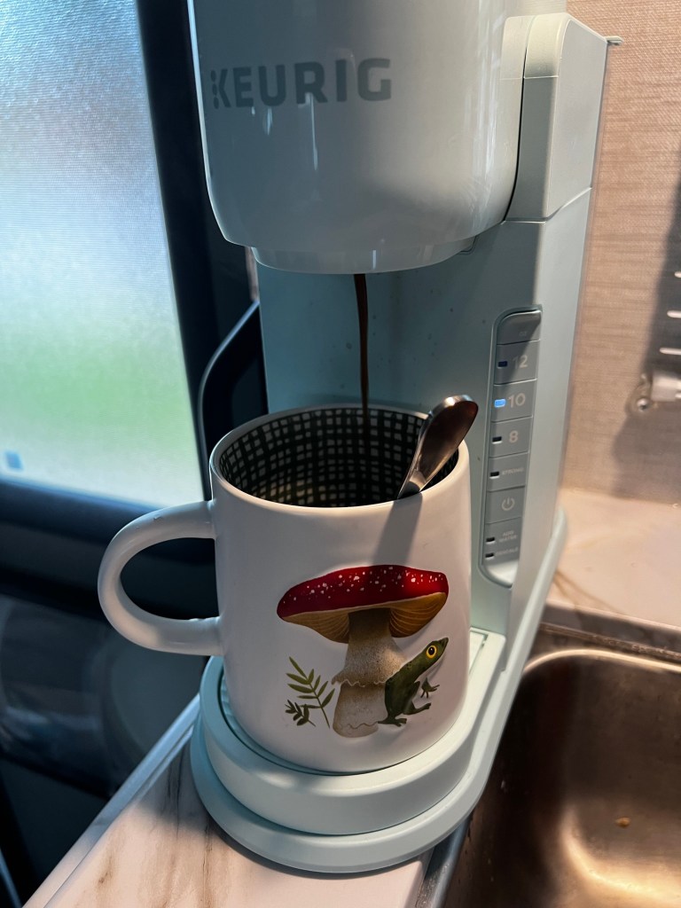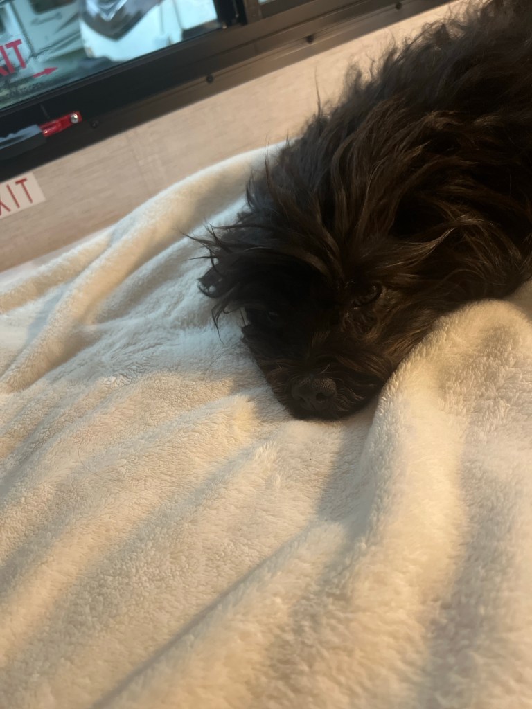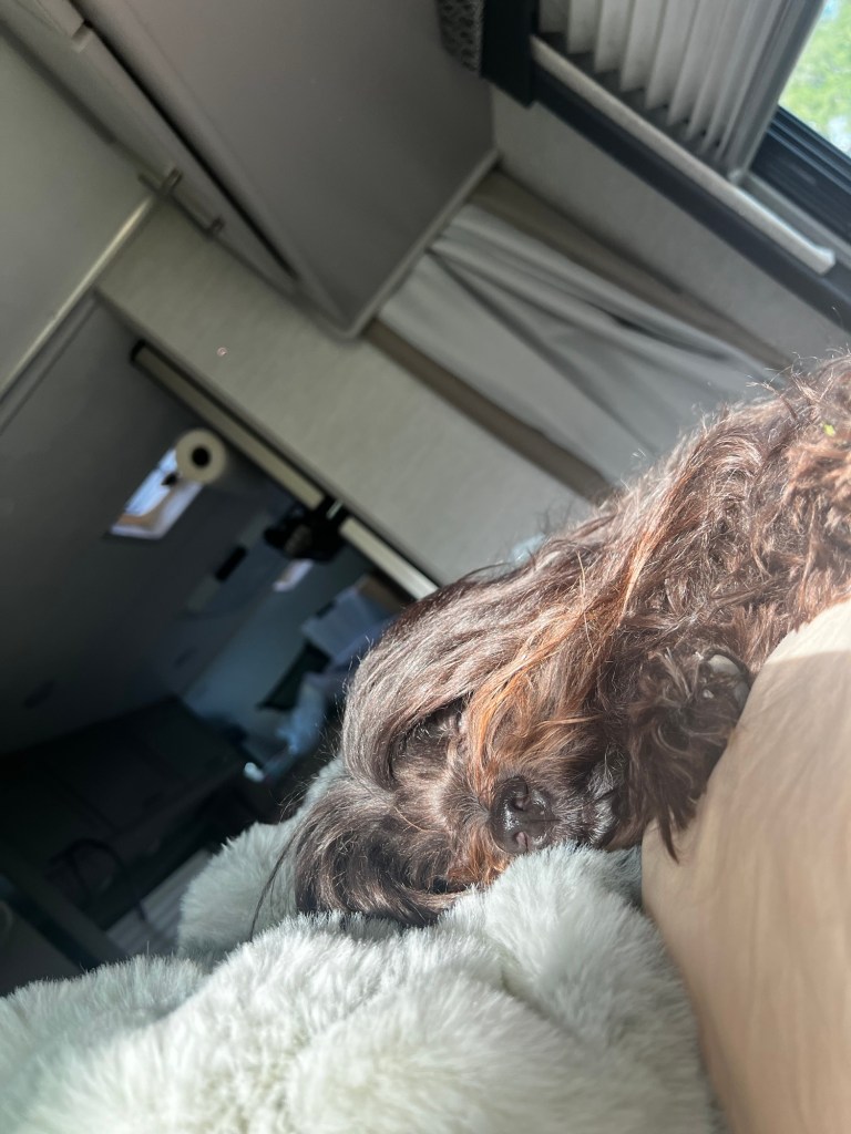 Kitty and I were sleep machines. It’s 10 am – still laying around.Camper coffee will help.