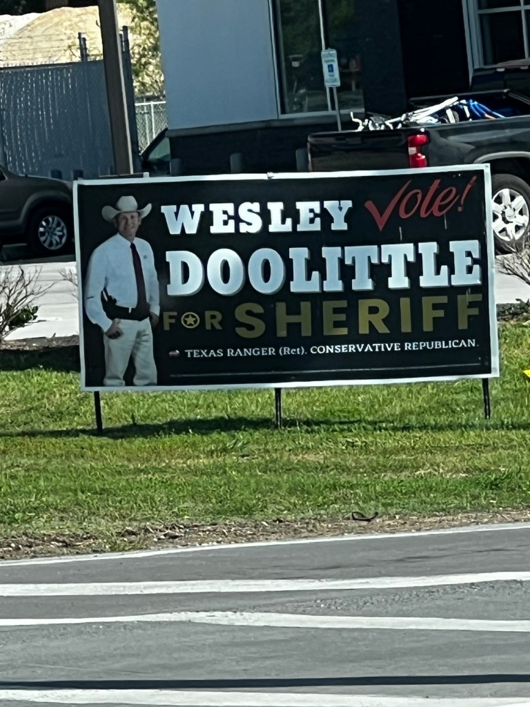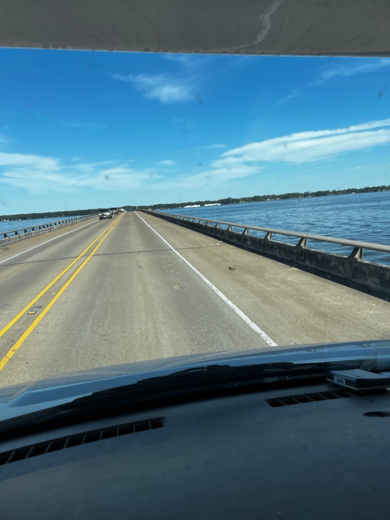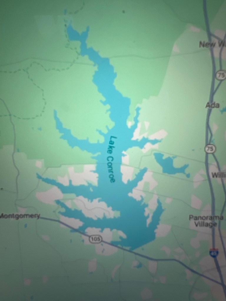 All Sherriffs and lawyers in Tx wear cowboy hats. Because- you know- Texas.Crossing a teeny tip of Lake Conroe.Lake Conroe was man- made about 1973, with a dam and water diverted from the San Jacinto River.