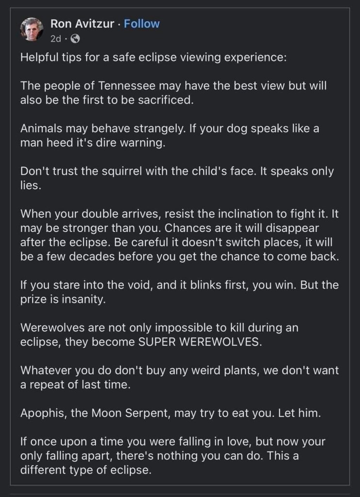 I have spent my entire day moving slow. It’s a wonderful way to live! As I doodle around, the shock, awe, and wonder of the Totality keep coming to my mind.
