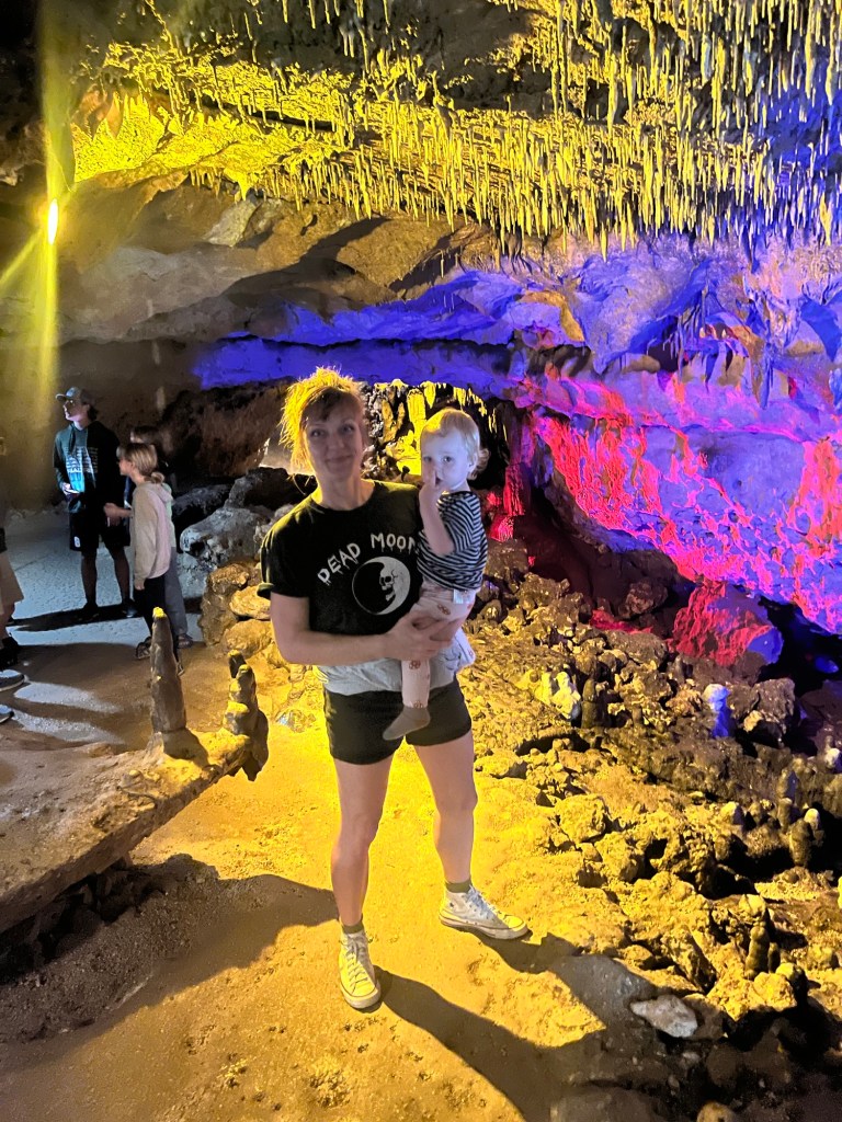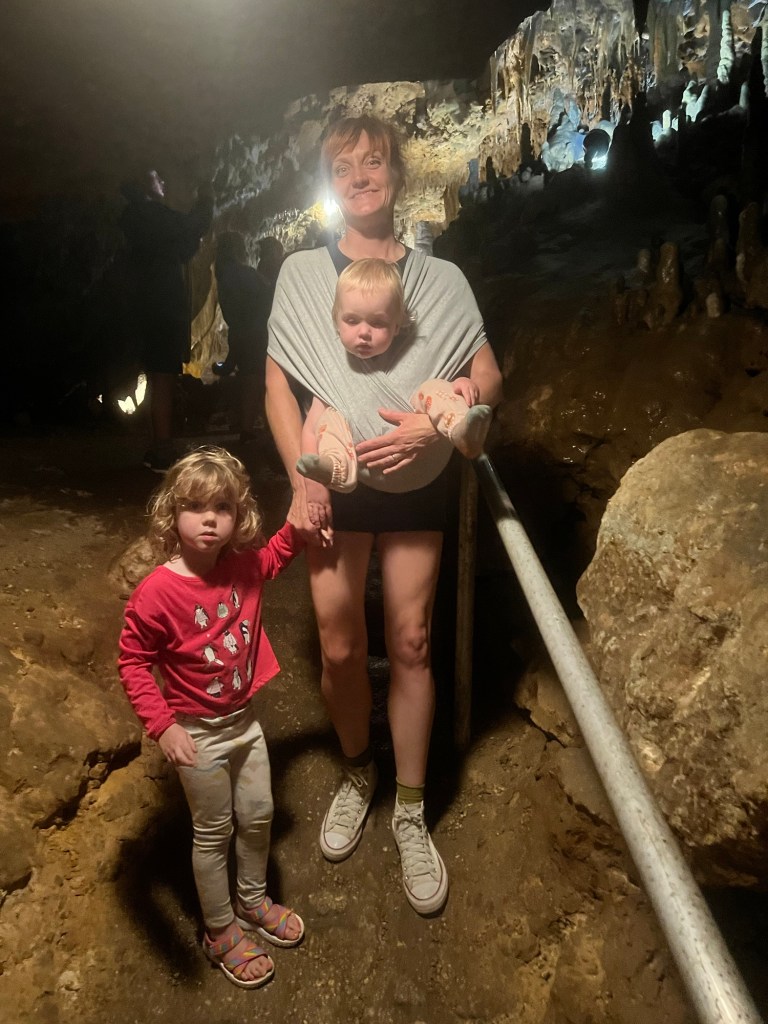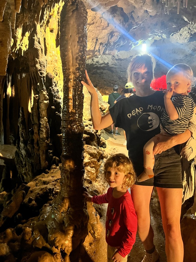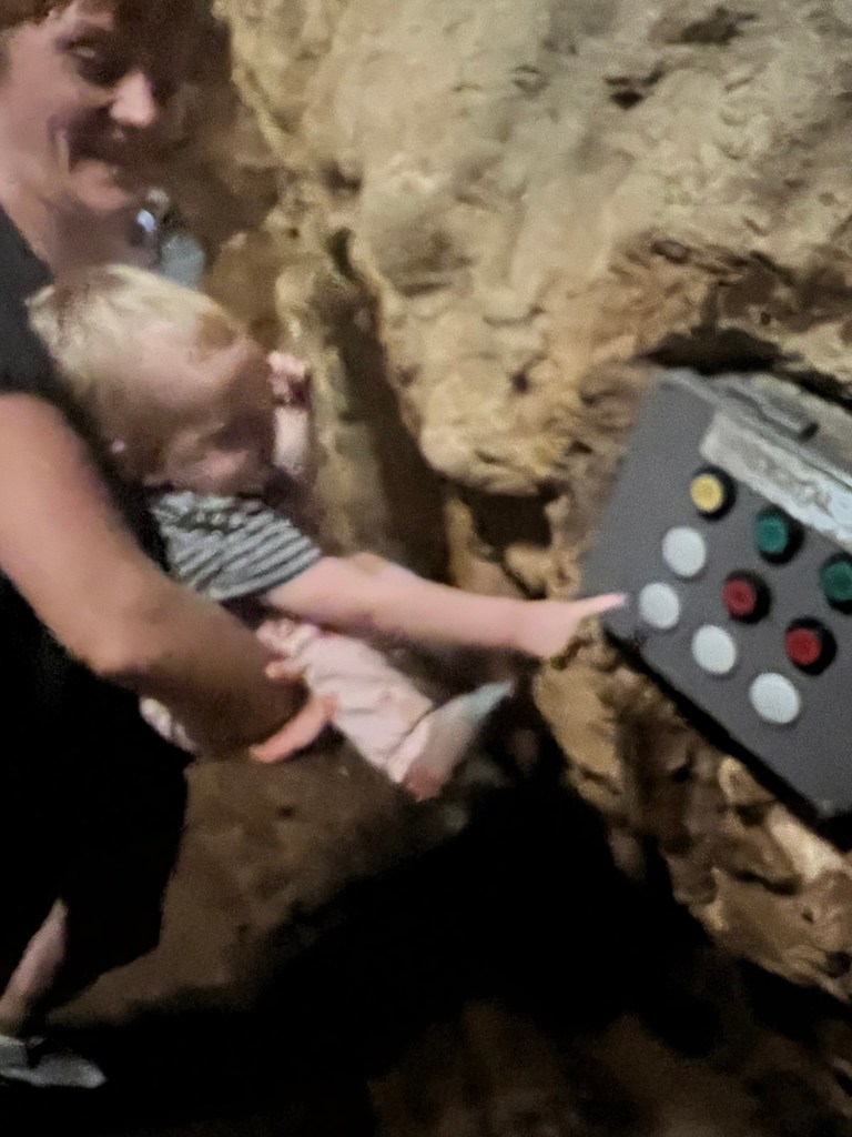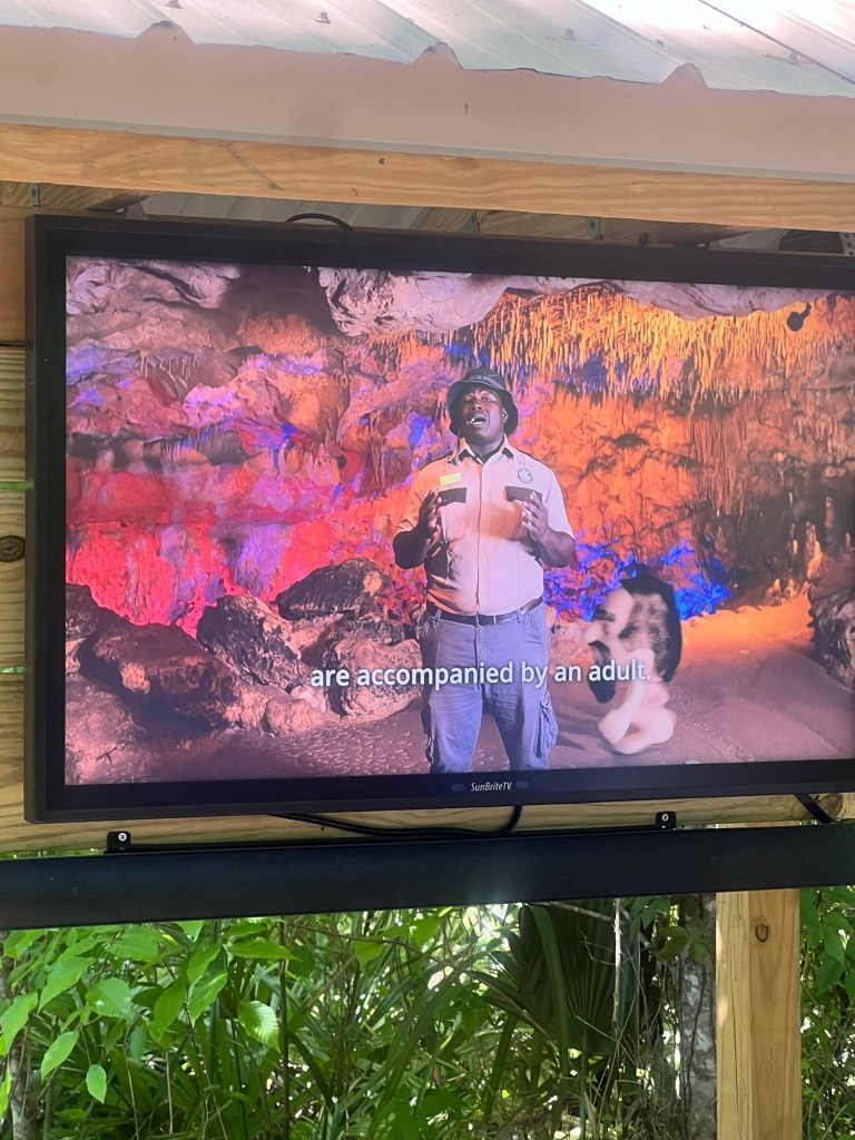 As I mentioned, we decide to stop and check out the Florida Caverns along the way. They start us off with a weird but fun little safety video that had lotsa y’all’s in it. In the video the ranger goes to a lot of trouble telling us to hang onto children so they don’t wander into the cave system. Note the little Homunculus on the lower left of the video. That’s a representation of a child, in North Florida, y’all. Tiny little cave men, all of them.