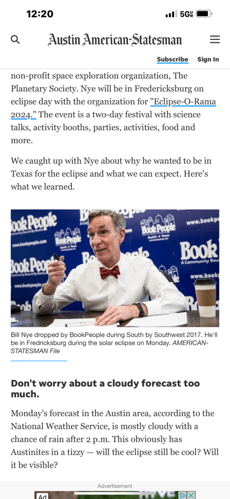 I am also going in a little early to eat dinner at a restaurant called The Well. I tried to look up the Austin City Limits venue but it appears there’s nothing tonight. They’re probably as worn out from that Eclipse as I am.