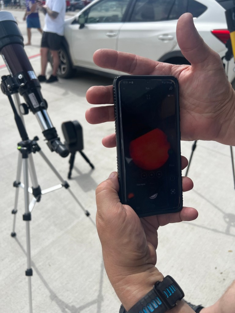 I had a sense of elation as I finally got to see the slow progression of moon passing across sun. It gets darker; we are in a strange twilight. The birds get quiet and crickets start chirping .