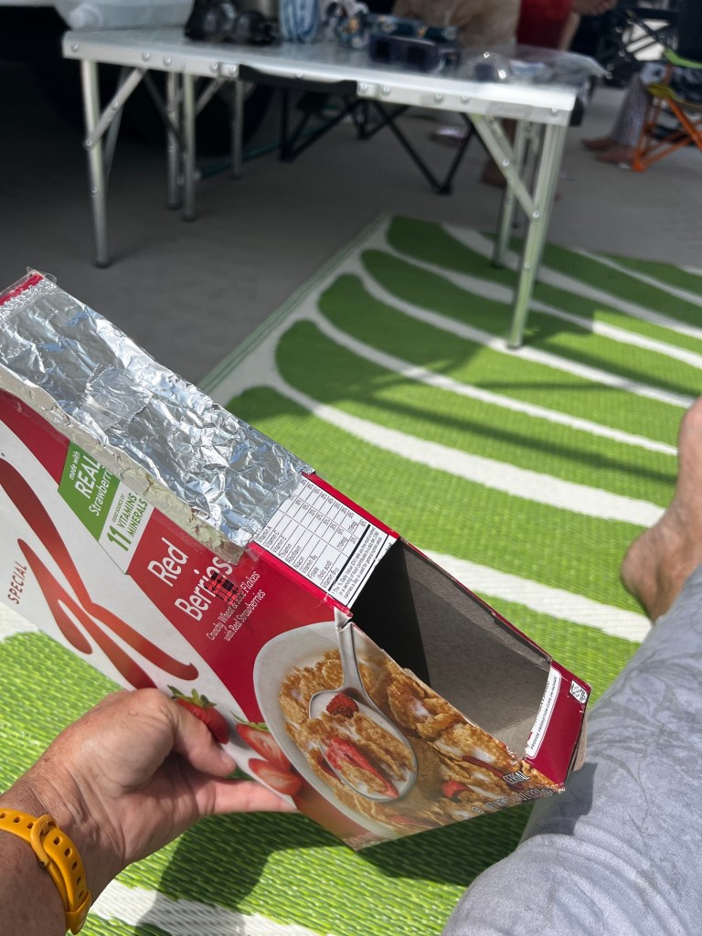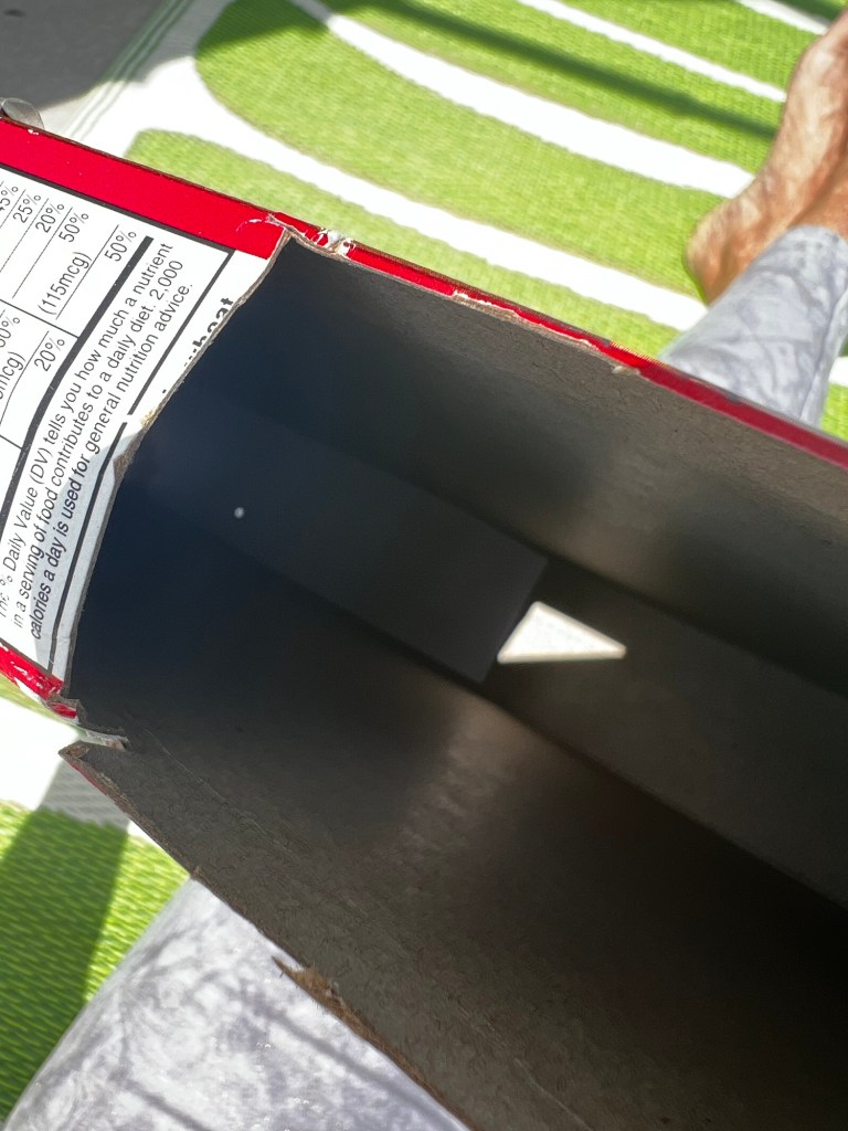 Science crafts are the best.It’s a cereal box with a pinhole in some tin foil!It’s the little round speck on the left. I hope some of you did this too.