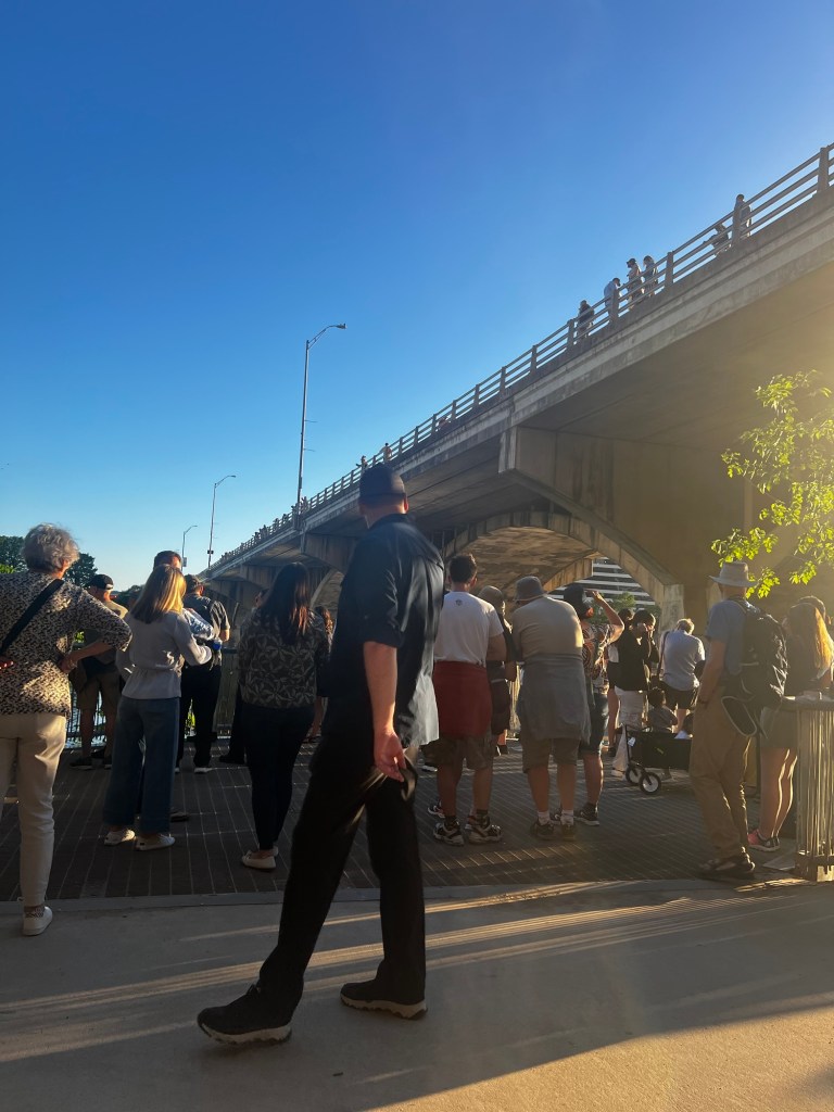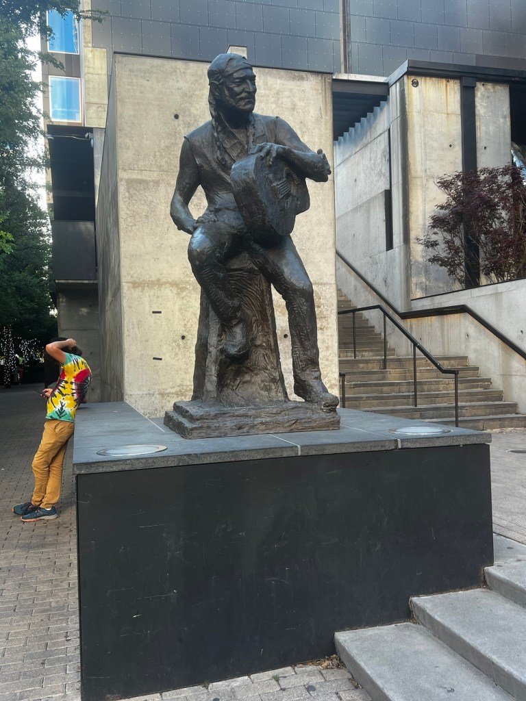 There were a lot more on this end. Some stragglers on the other end.Austin has a statue memorializing Willie Nelson at the foot of the bridge.
